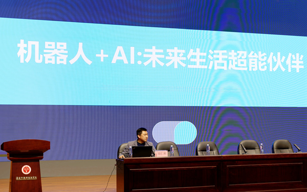 嘉宾讲座环节,民进淮阴工学院支部周仁和老师以“机器人+AI:未来工作生活的超能伙伴”为题,结合生动案例,深入浅出地讲解了人工智能对医疗、交通、教育等领域的革新,并与现场学生互动交流。