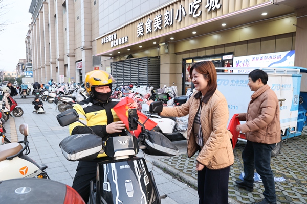 会员们还前往外卖小哥聚集区域,将满载祝福的春联和“福”字送到他们手中。