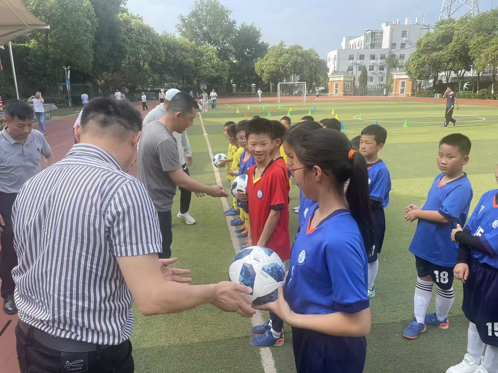 蔡昆科长、学校毛小雷校长、支部副主委张霆为孩子们赠送了高品质的小足球