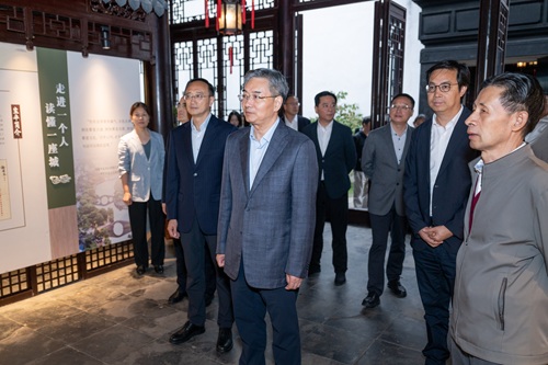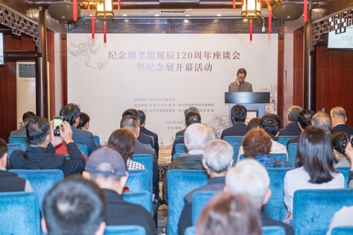 与会领导嘉宾参观谢孝思诞辰120周年纪念展。主展厅用“黔山育才·江南结缘”“万象更新·古城肇兴”“远见卓识·危难救急”“一核双轴·古韵今风”4个篇章,详细讲述了谢孝思奔走呼号,修复园林和保护古城的事迹。两侧厢房设“艺术人生·笔墨写意”“清正长留·风雨同舟”两个篇章,展示了谢孝思为保护苏剧、昆剧、彩绘、刺绣等苏州文化元素所作的努力,以及他作为民进苏州市地方组织主要创始人和核心领导者,为组织发展和“书画拥军”等特色工作开展作出的卓越贡献。