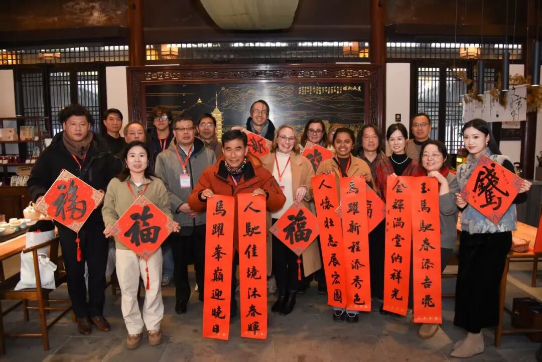 在方塔园文华堂,外国友人们欣赏了由常熟民进会员带来的多项非遗艺术表演:马千里老师带来了古筝演奏,旋律清韵悠扬,让现场观众沉醉其中;崔艳华老师展示了剪纸技艺,纸花翻飞间,栩栩如生的图案跃然眼前;时云仿老师与葛丽萍老师现场书写春联和“福”字,赢得阵阵赞叹。