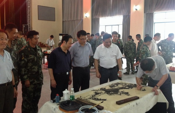 7月24日,无锡市政协副主席、民进市委主委章一中带领我会顾青蛟、陈德华、王东海等书画家赴驻锡武警8721部队某团开展书画拥军活动。