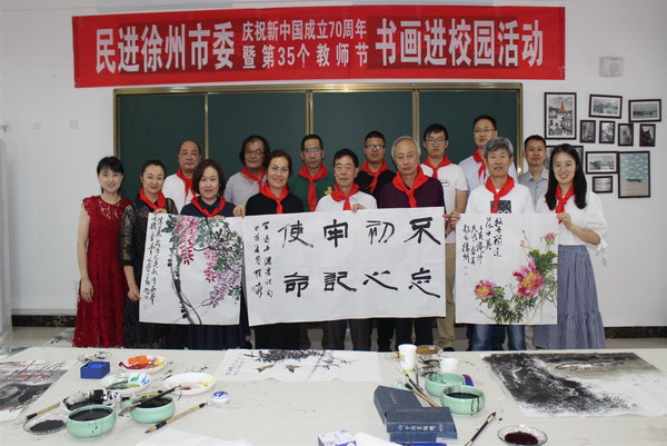 9月3日下午,民进徐州市委在百年名校——市青年路小学举办庆祝新中国成立70周年暨第35个教师节书画进校园活动,徐州民进的书画家们通过笔墨丹青为老师送上节日的美好祝福。市人大常委、民进市委专职副主委王德志,市教育局党委委员、副局长李清,市青年路小学教育集团党支部书记、校长刘婷,市委统战部党派处刘博文等参加活动。