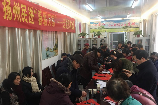 2月7日下午,民进扬州市委文化支部书画名家郭剑峰、成中平、贾修森、杜江等一同走进邗沟社区,举办扬州民进“春联万家”活动,为社区送上献上新年的祝福,民进扬州市委副主委张一军、帅潇等参加活动。