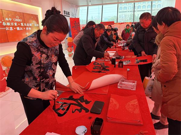 丹阳基层委员会文化支部部分会员、其他支部会员中的书画家和书法爱好者们齐聚展厅,铺纸研墨,即兴创作。他们以笔寄情,以字达意,一幅幅寓意吉祥的春联、一张张气韵生动的“福”字跃然纸上,红纸映衬着墨香,营造出浓郁的传统年味。会员们还亲手将春联、“福”字与温暖送给经过的市民、参观者以及社区五保户等群体。