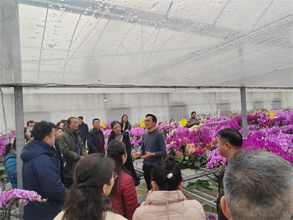 首站,会员们来到春城蝴蝶兰基地。在基地负责人、句容市农林职业技术学院副教授张鸣峰的引导与讲解下,大家进入温室大棚和成品展示区实地观摩。据张鸣峰介绍,蝴蝶兰被誉为“兰中皇后”,目前我市已形成蝴蝶兰规模化培育基地,形成瓶苗、杯苗和成品花全产业链体系。此外,张鸣峰还向大家介绍了基地在名优品种选育、智能化环境控制、精准水肥管理和电商运营等方面取得的新突破。参观过程中,大家围绕科技赋能现代农业、特色产业品牌打造等议题,与基地工作人员进行了深入交流。