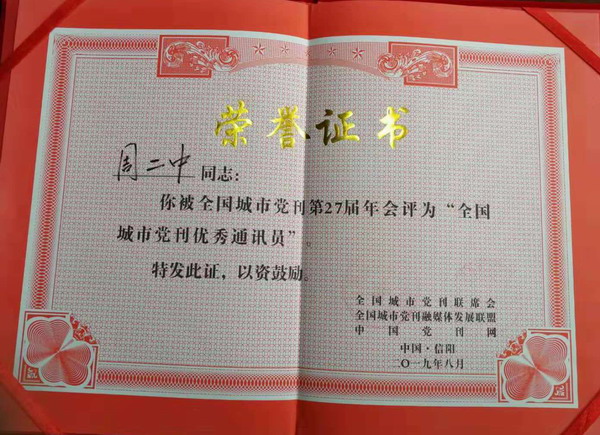 会上,由江苏常州市委党刊《开创》推荐的民进会员周二中被全国城市党刊联席会、全国城市党刊融媒体发展联盟和中国党刊网评为“全国城市党刊优秀通讯员”。(附证书照片)周二中现为民进常州市委工作人员。