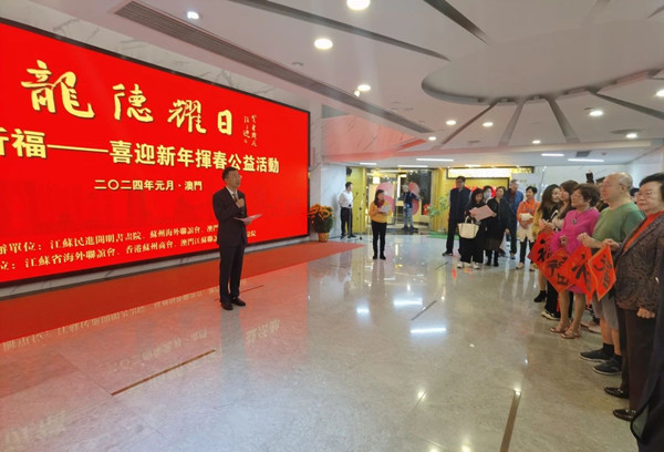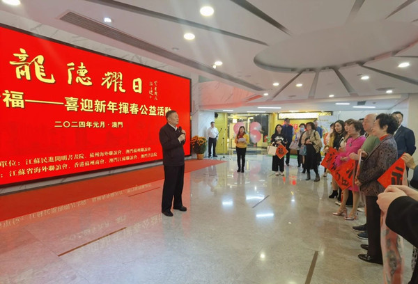 2月4日,“龙德曜日2024祈福”——挥春迎新年公益活动在澳门举行。本次活动由江苏省海外联谊会、民进江苏省委会指导,江苏民进开明书画院、苏州市海外联谊会、澳门苏州联谊会主办。江苏省政协副秘书长、民进江苏省委会专职副主委余珽,中共苏州市委统战部副部长、苏州市侨办主任、苏州海外联谊会副会长王建方,江苏民进开明书画院书画家徐圭逊、晏明、姚媛、伍根元、王渊清、李守卫等参加了活动。本次活动旨在传承新春佳节传统风俗,弘扬中华优秀文化,加强苏澳两地文化交流合作,激发中华儿女的家国情怀。
