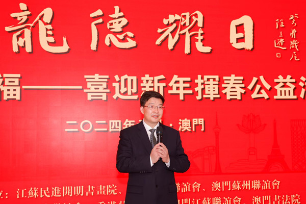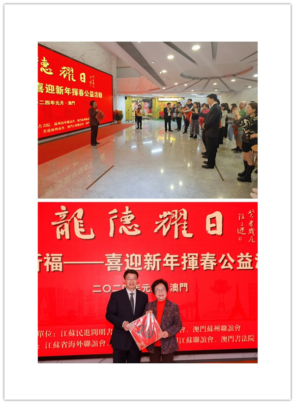 2月4日,“龙德曜日2024祈福”——挥春迎新年公益活动在澳门举行。本次活动由江苏省海外联谊会、民进江苏省委会指导,江苏民进开明书画院、苏州市海外联谊会、澳门苏州联谊会主办。江苏省政协副秘书长、民进江苏省委会专职副主委余珽,中共苏州市委统战部副部长、苏州市侨办主任、苏州海外联谊会副会长王建方,江苏民进开明书画院书画家徐圭逊、晏明、姚媛、伍根元、王渊清、李守卫等参加了活动。本次活动旨在传承新春佳节传统风俗,弘扬中华优秀文化,加强苏澳两地文化交流合作,激发中华儿女的家国情怀。