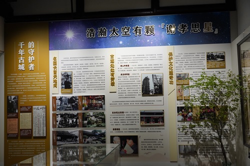 美术馆内,有谢友苏的新作展和许多关于江南文化的文创产品,手绘明信片、苏扇等体现了江南文化的深厚底蕴和现代创意的巧思。馆内浓墨重彩的一笔,是其父谢孝思的生平介绍,在这里,可以读到这位千年古城的守护者,如何团结一众民进会员和相关领域专家,亲力亲为,无私捐赠,保存园林古迹,为苏州市文化艺术和教育事业做贡献。