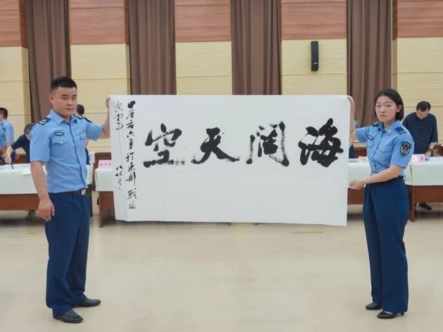 徐圭逊代表民进省委会向东部战区空军赠送了一幅书法作品:“练铁翼神剑,铸蓝天长城,写家国情怀,守万里苍穹”。