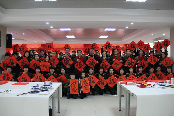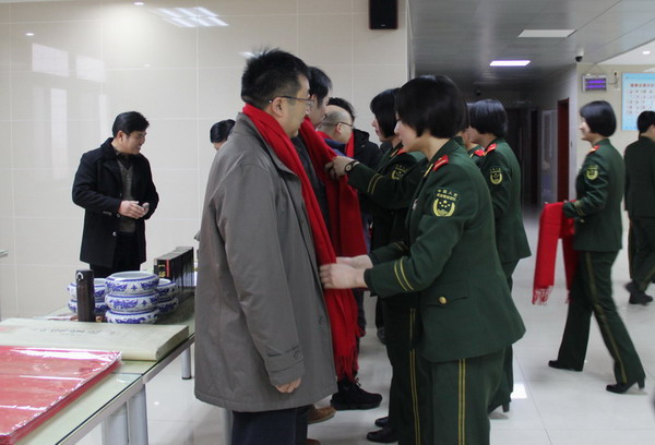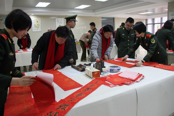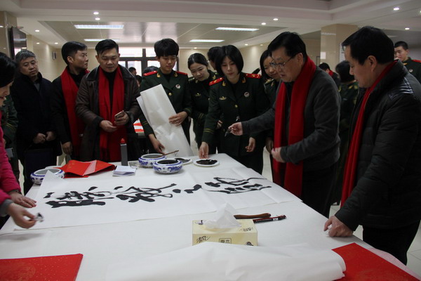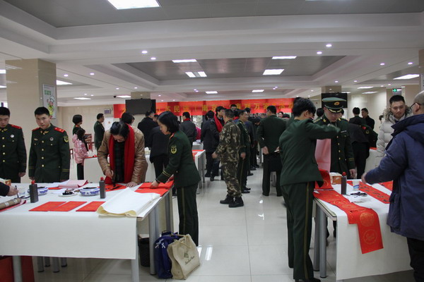 在省政协副秘书长、民进省委副主委朱毅民和著名书画家、江苏民进江海书画会会长萧平教授的带领下,十多位会内书画名家为日夜守卫江苏平安的武警官兵和家属,以写春联送福字的形式,送去民进组织满满的新年祝福。