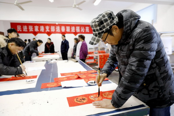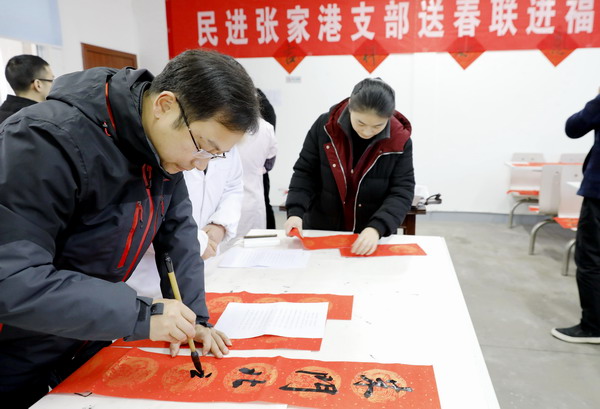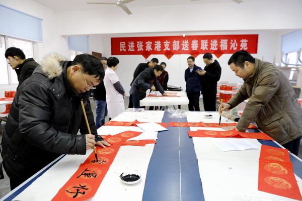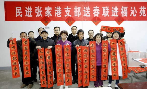 一上午大家共写了近百副春联。春联写好后,民进张家港支部会员们还到院内,帮助老人张贴一副副春联。