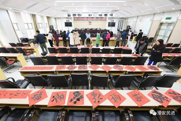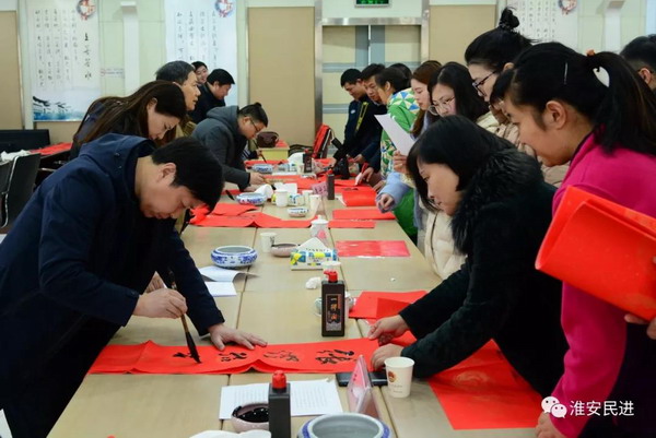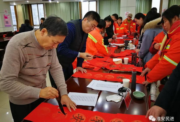 “春联万家”活动是由民进中央主办的一项全国性的文化惠民活动,旨在发挥民进文化界别优势服务社会,弘扬中华传统文化,引导基层文化建设。每年春节前夕,民进淮安市委按照民进中央要求和民进省委部署,积极组织会内书画家走进基层,为我市各界群众送去民进的“新春祝福”,增添欢乐的节日氛围,赢得了社会广泛赞誉。