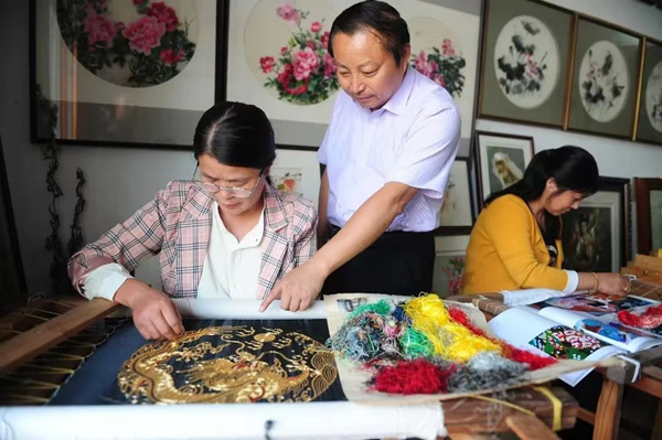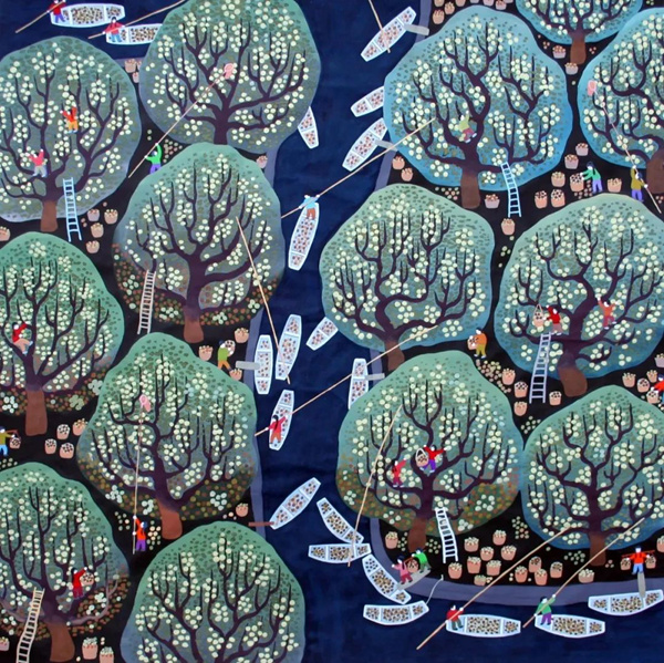 自1987年担任博里镇文化站副站长起,潘宇不仅自己创作,还致力于培养农民画作者,潜心指导农民画作者学习创作,从不计较个人得失。在镇党委政府的支持下,他创建农民画院,将博里农民画发扬光大,助力村民脱贫致富。为促进农民画艺术成果更快转化,他创造性地将农民画与刺绣工艺有机结合,成立刺绣坊,作品远销海外,实现“非遗变现”。